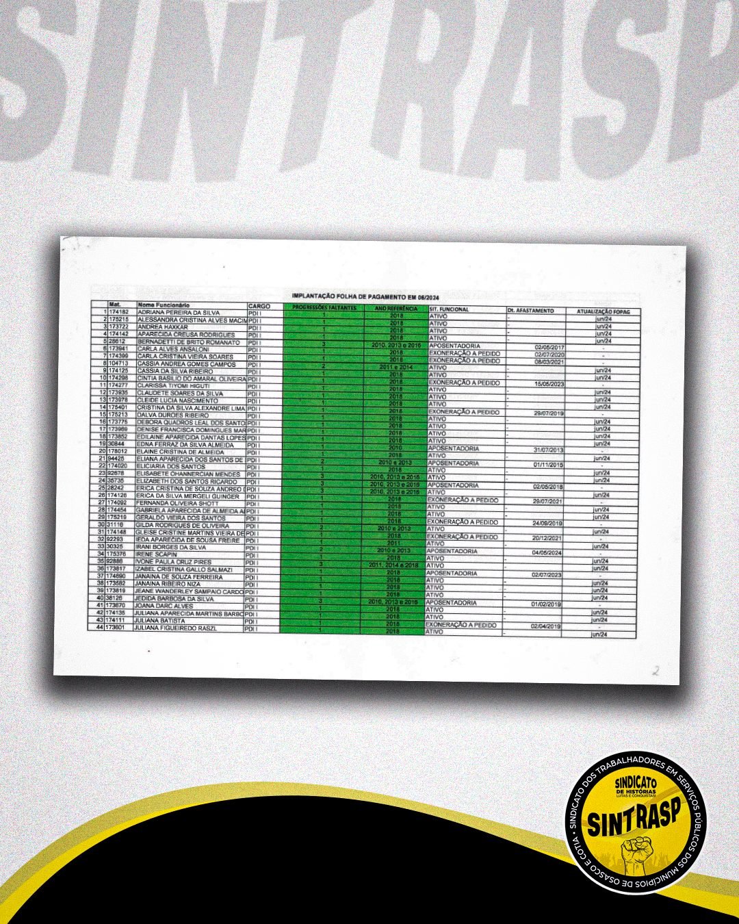 O Professor deverá pegar o holerite do mês de maio de 2024 e de junho de 2024, para confirmar se recebeu essas progressões, confrontando com a tabela anexada pelo Sintrasp no processo, e caso verificar algumas divergências em suas progressões, deverá procurar o Sintrasp com as cópias dos holerites de maio e junho de 2024.