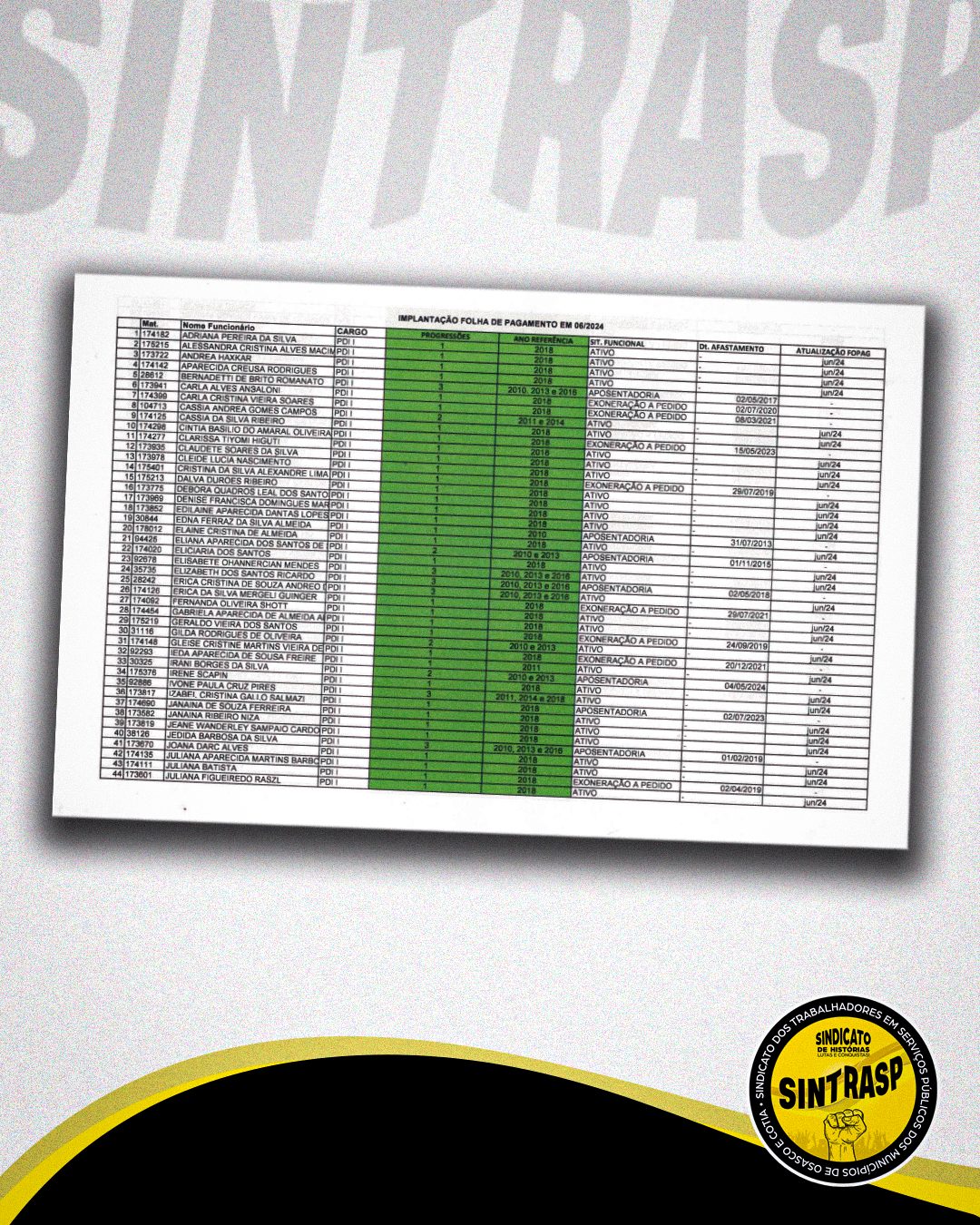 A listagem apresentada pela Prefeitura ainda não trouxe informações completas sobre a data de atualização de todos os Professores inativos, situação que já foi questionada pelo Sintrasp no processo.