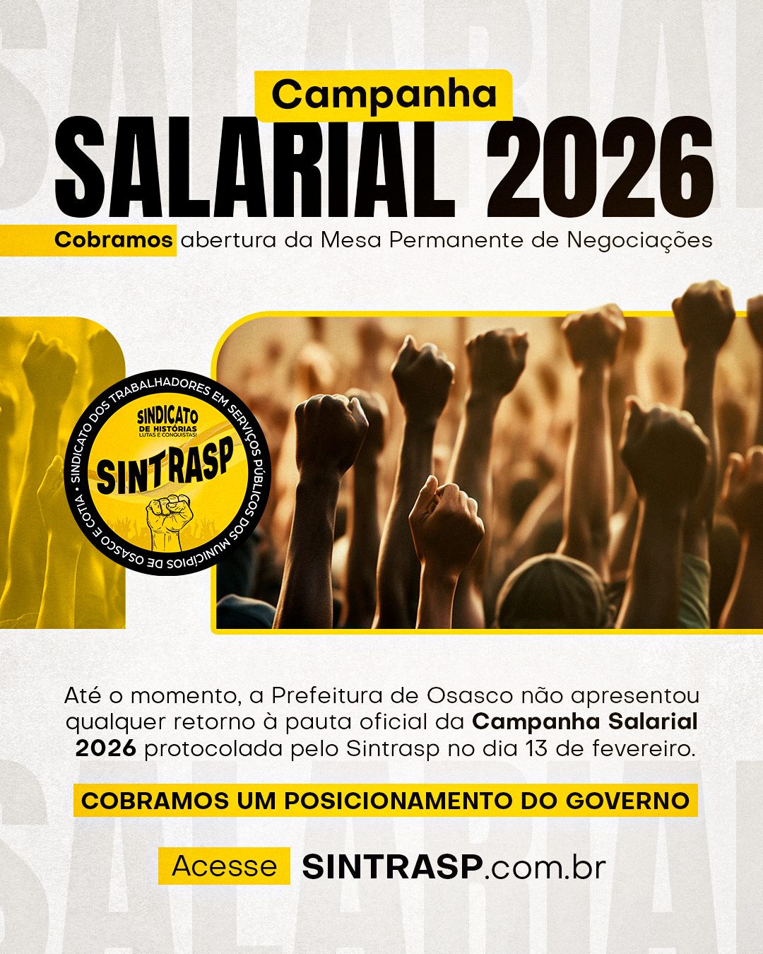 O Sintrasp protocolou no dia 13 de fevereiro a pauta oficial da Campanha Salarial 2026, mas até o momento a Prefeitura de Osasco não apresentou qualquer retorno. Diante do silêncio da Administração, o Sindicato cobra com urgência a abertura da Mesa Permanente de Negociações, para que o reajuste salarial e as demais reivindicações da categoria sejam discutidos de forma séria, transparente e definitiva.