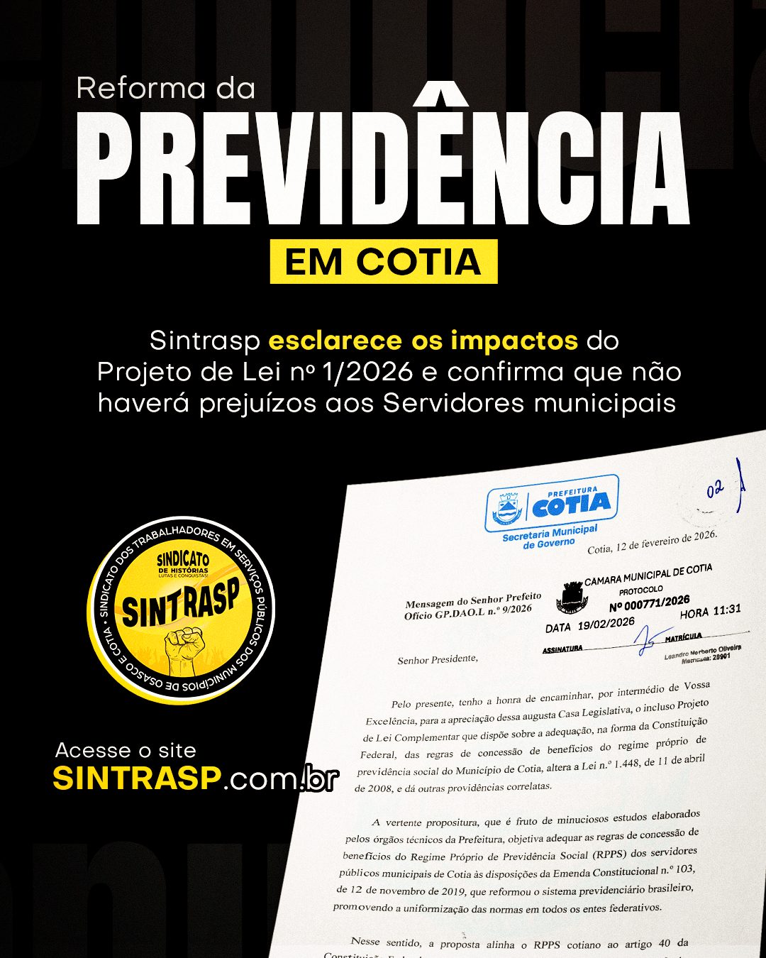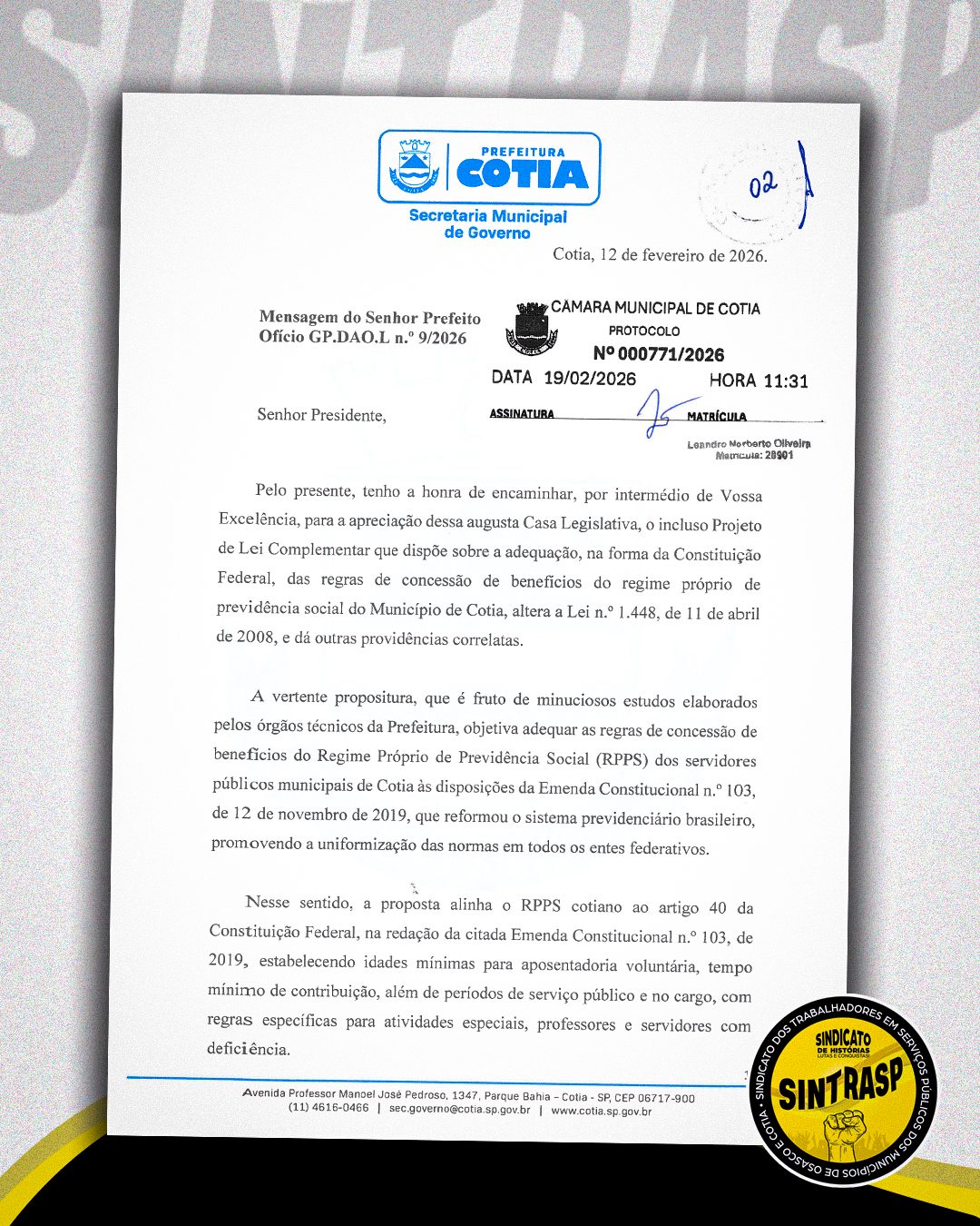 Após quase sete anos da promulgação da Emenda Constitucional nº 103, de 2019, a cidade de Cotia segue na adequação do regime próprio de previdência às diretrizes federais. Diante da tramitação do Projeto de Lei nº 1/2026, que altera as regras da Cotiaprev, o Sintrasp analisou os contornos da proposta. Nossa avaliação técnica confirma que a reforma aplicada agora não representa prejuízo direto ao Servidor. Isso porque, uma vez estabelecida a legislação nacional, os municípios têm a obrigação de se adequar, não lhes sendo facultativo criar regimes diferenciados.
