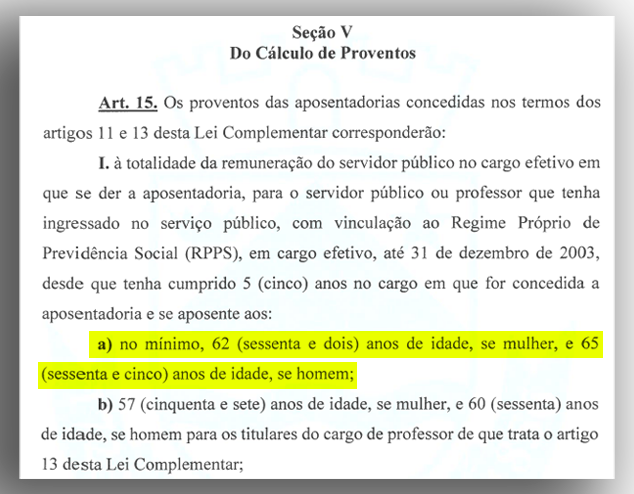 As idades mínimas de aposentadoria no regime geral e nos casos em que a previdência própria foi atualizada a Constituição Federal são: 62 anos para mulheres e 65 anos para homens.