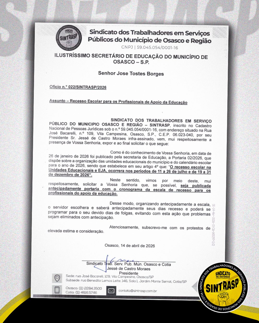 O Sintrasp protocolou nesta terça, dia 14 de abril, o Ofício nº 32/2026, direcionado à Secretaria de Educação. O documento solicita que seja publicada antecipadamente portaria com um cronograma da escala de recesso para os profissionais do Apoio da Educação. A medida visa proporcionar maior clareza e organização para esses Servidores. Tendo definido antecipadamente o período – 11 a 26 de julho ou 19 a 31 de dezembro de 2026 – os trabalhadores poderão se programar para o uso devido de seus dias de folga.