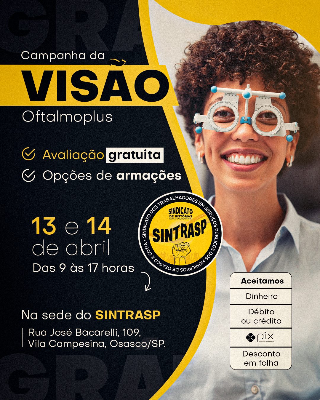 O Sintrasp, em parceria com a Oftalmoplus, preparou uma novidade especial para os Servidores associados! Realizaremos uma Campanha da Visão GRATUITA, voltada ao cuidado e prevenção da saúde visual. A ação acontecerá nos dias 13 e 14 de abril, das 9 às 17 horas, na sede do Sindicato – rua José Bacarelli, 109, Vila Campesina, Osasco/SP.