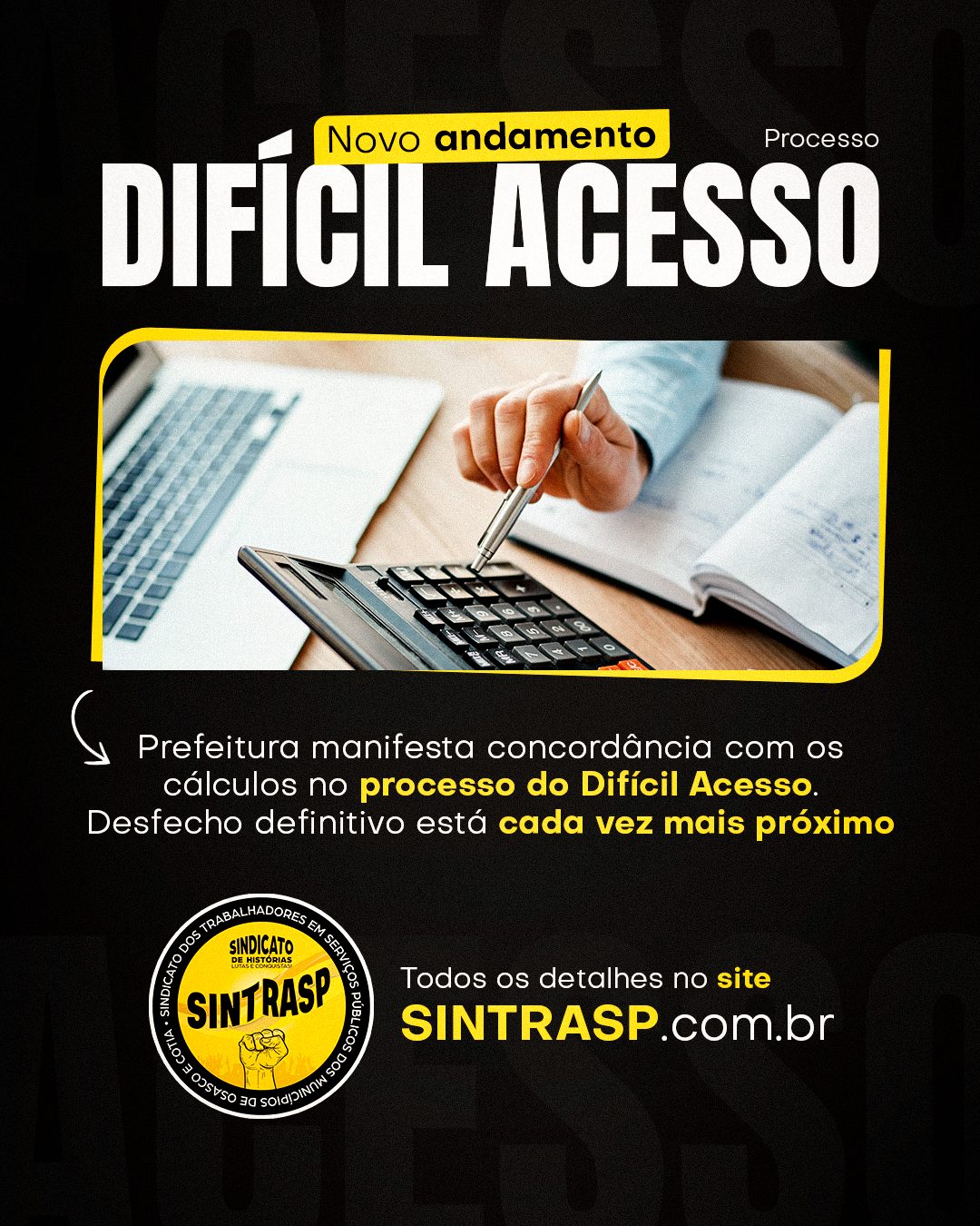 No início de março, o Sintrasp informou em seu site o protocolo no Judiciário referente à atualização completa dos cálculos do processo coletivo do Difícil Acesso – uma medida fundamental para destravar o andamento da ação e avançar rumo à sua fase final.