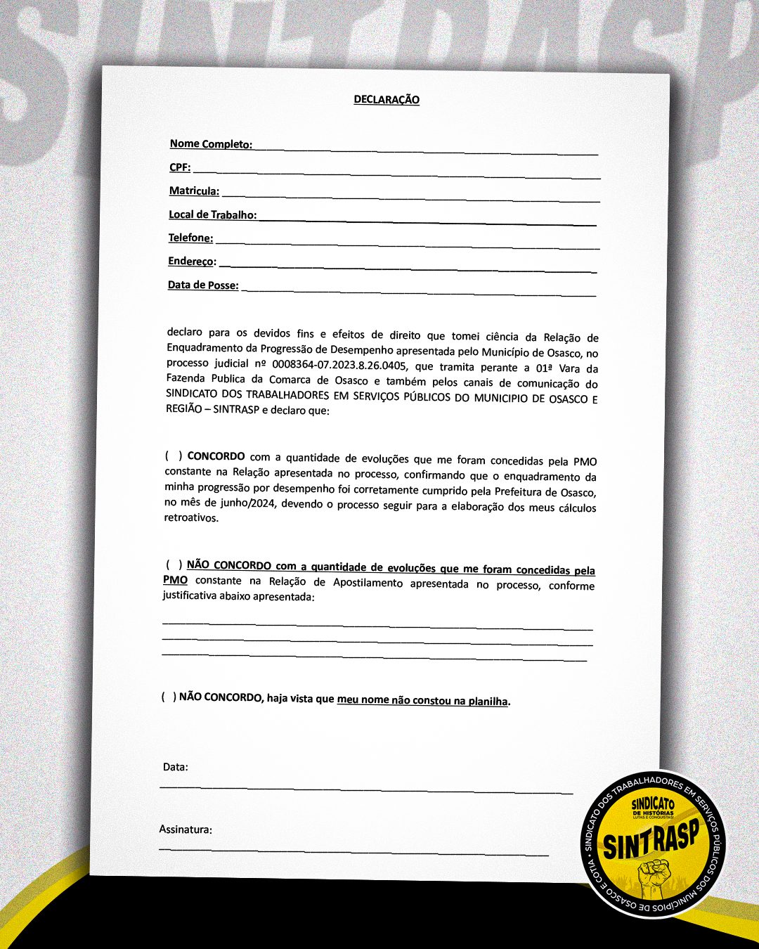 O formulário é o instrumento oficial para validar o correto enquadramento nas Progressões. O Sindicato reforça a orientação para que nenhum profissional deixe de realizar a checagem, sob risco de prejuízos futuros. Ao concluir a análise, o Servidor deve escanear e anexar online o termo devidamente assinado dentro do limite estipulado.